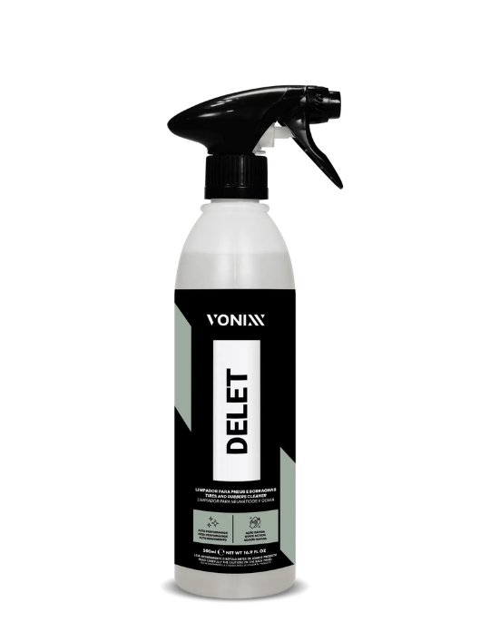 Delet é um limpador de alta performance, formulado exclusivamente para remover sujidade severa em pneus e borrachas, garantindo total limpeza, desenvolvendo originalidade e sem deixar aspecto acinzentado. Essa limpeza ajudará a melhorar a performance dos produtos para condicionar os pneus.
