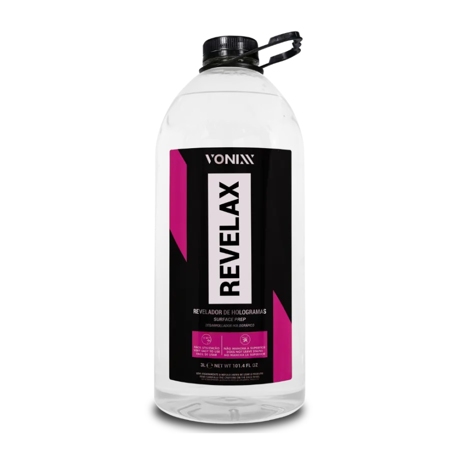 Revelax evidencia defeitos da pintura, como hologramas e swirls mascarados por ceras, selantes e polidores. É também recomendado para limpeza de vidros e descontaminação de plásticos, principalmente antes da aplicação de V-Plastic, removendo produtos como silicones e contaminações diversas. Seu uso deixa a peça pronta para inspeção antes de qualquer trabalho.