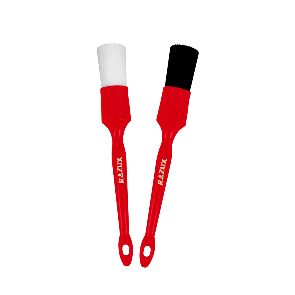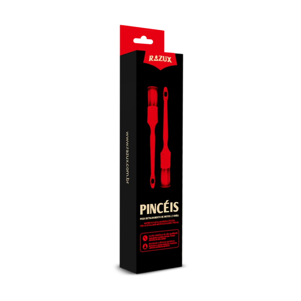 O kit de pincéis para motociletas Razux foi desenvolvido para detalhamento de motocicletas em geral. O kit é composto por duas unidades, sendo a primeira cerdas macias para detalhamento de partes mais delicadas e a segunda de cerdas rígidas para limpeza em geral.